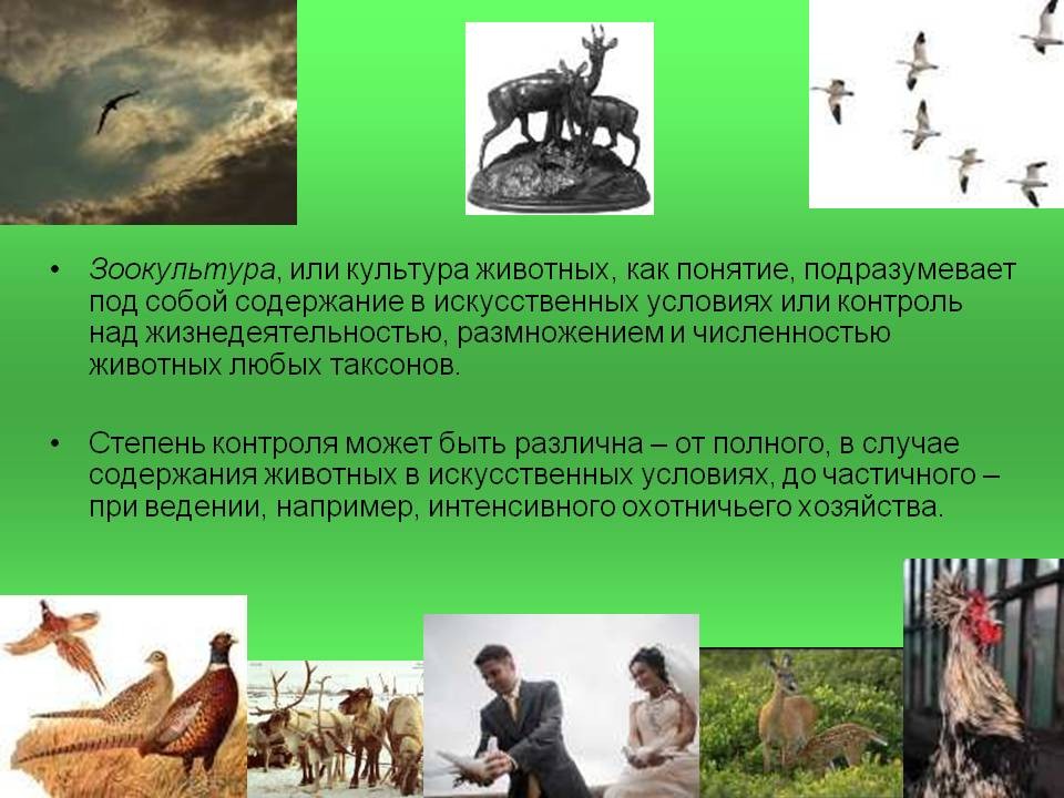 По своей сути все охотничье дело в развитых странах, где преобладает использование методов биотехники, может считаться одной из форм зоокультуры. Промысловое хозяйство, базирующееся на экологически обоснованных нормах рационального использования популяций, также может быть отнесено к культурной форме использования фауны.