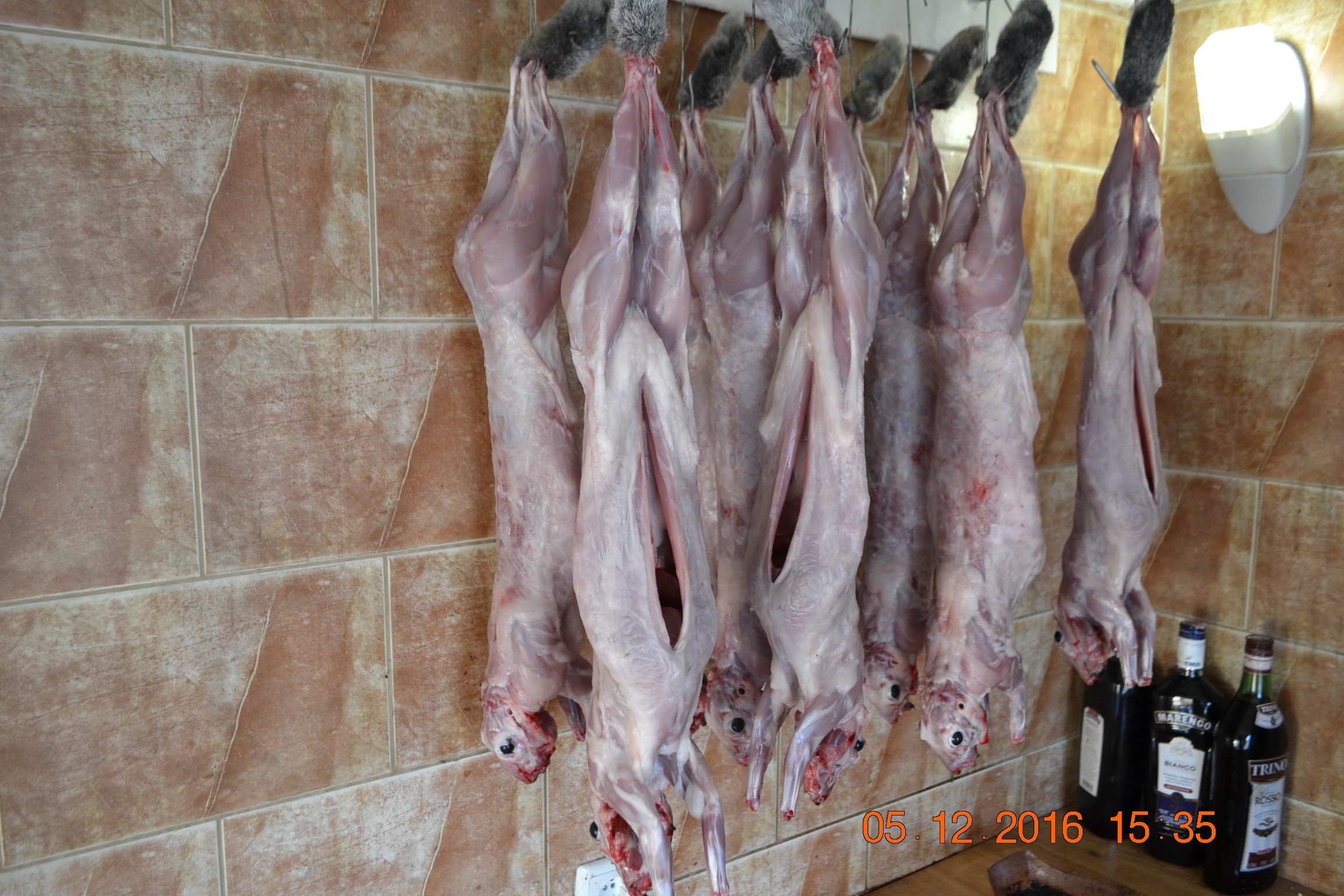 При забое кролика его поднимают за задние ноги и ударяют палкой по голове, после чего для лучшего стока крови удаляют глаз. Убитого кролика подвешивают за задние ноги на железные крючки и приступают к съемке шкурки. Снимают их, как правило, трубкой. Для этого делают надрезы кожи вокруг скакательных суставов задних ног, затем по задней стороне бедер до заднепроходному отверстия. После этого снимают шкурку с задних ног, удаляют позвонки из хвоста и стягивают шкурку вниз к голове, подрезая при необходимости подкожную пленку ножом. После съемки шкурки с туловища обрезают передние лапы, запястный сустав, освобождая лапы из шкурки, и снимают шкурку с головы, перерезая ушные хрящи, кожу вокруг глаз и ротового отверстия.
